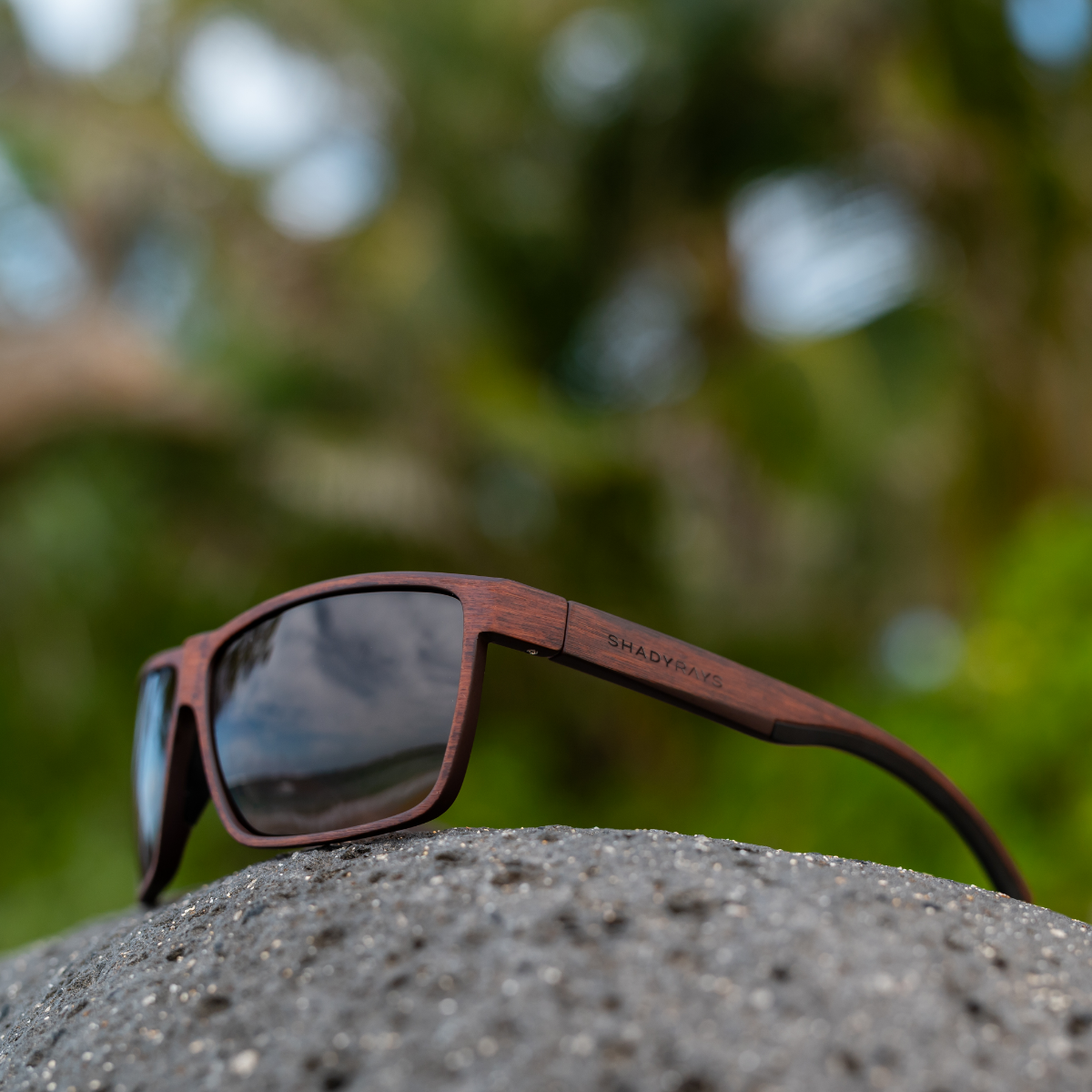 Matte deep wood grain pattern TR-90 frame with raised logos.
