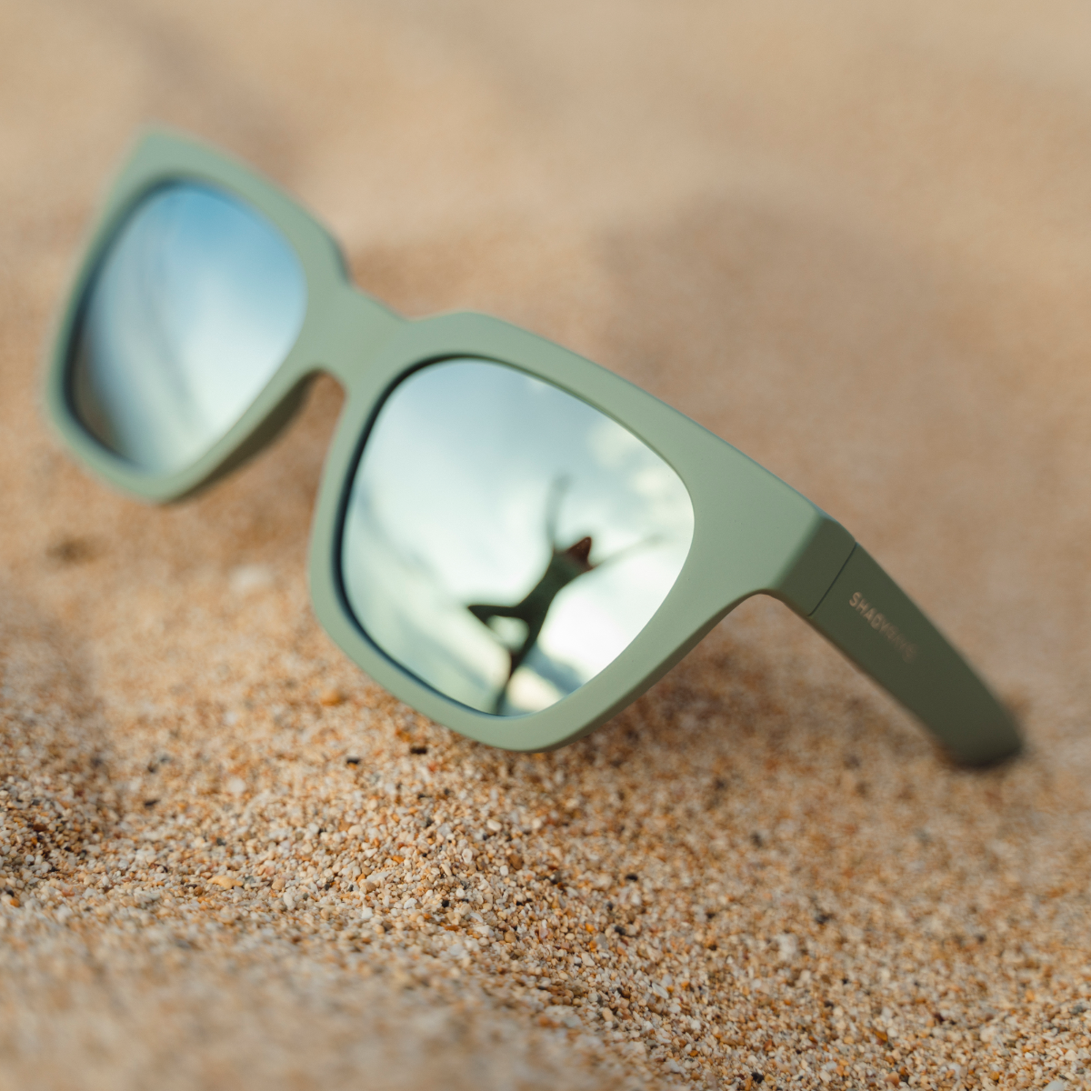 Polarized agave mirrored lens with grey tint, and shatterproof, anti-scratch lenses