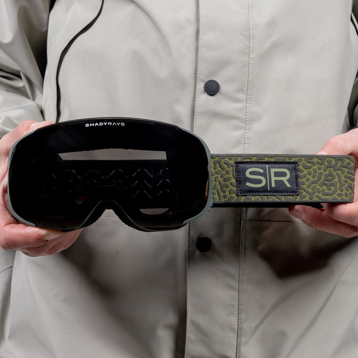 It features our magnetic Denali mask in matte green. The Bronze Mirror lens (PC, 21% VLT) delivers superior clarity and protection in high light. The coordinating strap completes the look with its bold logo. Keep your gear organized in the soft storage pouch and safeguard your lens on the slopes with the plush microfiber sock.