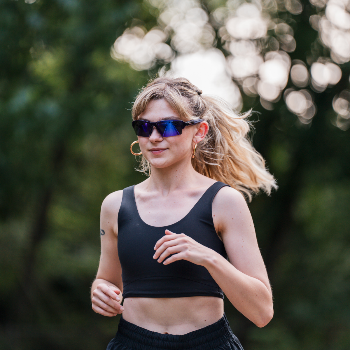 No-slip fit- rubber adjustable nose pad with air-flow sweat channels, and dual injected rubber temple tips.