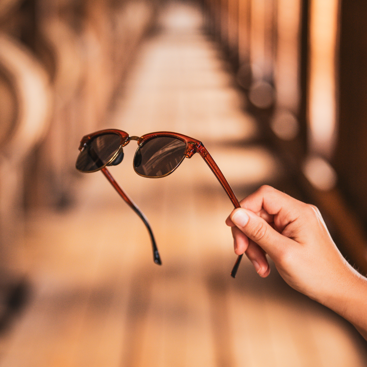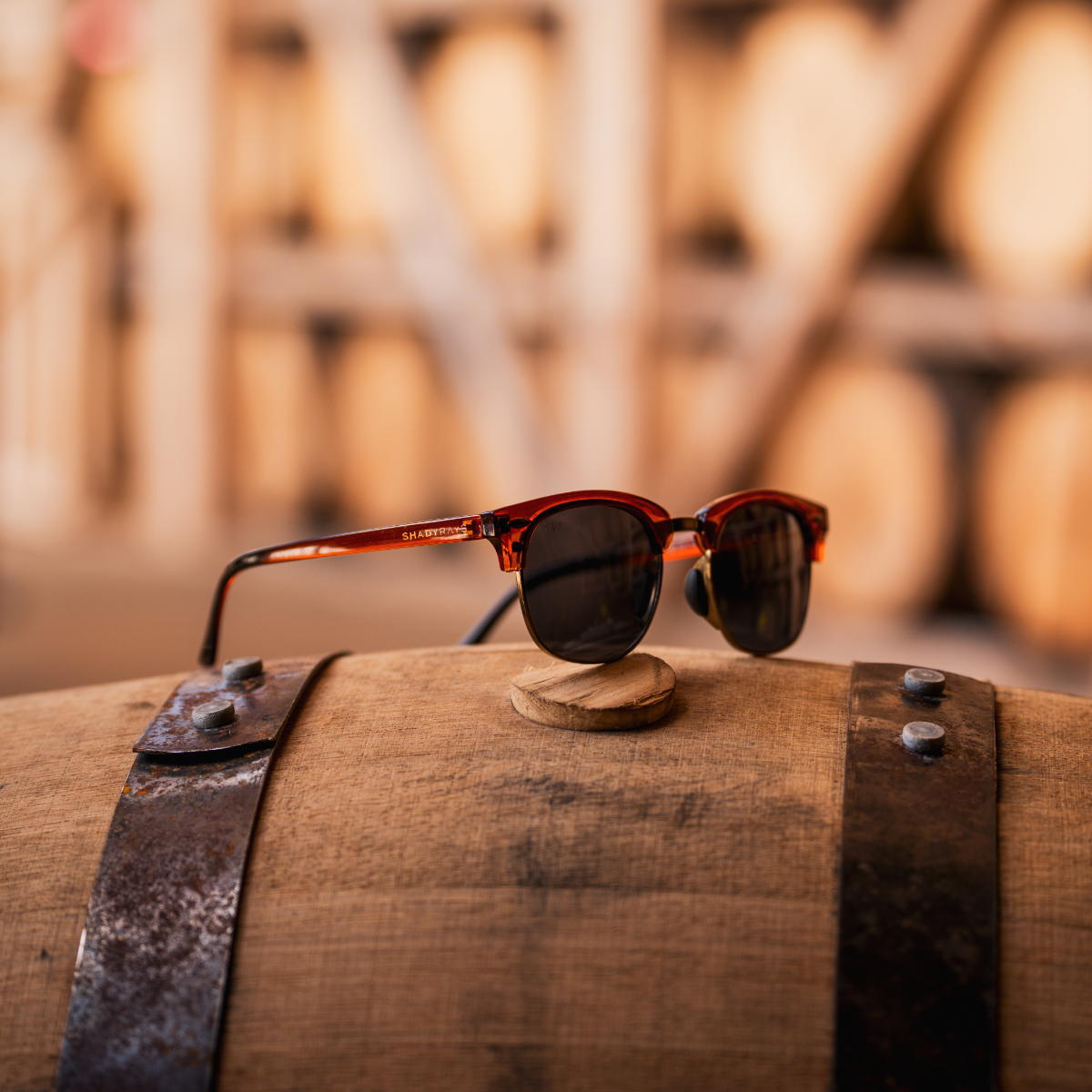 Bourbon gloss frame with metal hinges, copper accents, and charred-barrel fade on temple tips